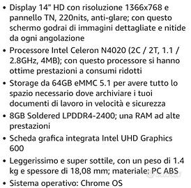Vendo Chromebook IdeaPad 3Lenovo, 8 giga di RAM, per inutilizzo. Display 14 " HD. Colore del PC blu abisso. Dimensioni disco rigido 64 GB. Processore Intel Celeron N4020. Usato poco, in ottime condizioni, pari al nuovo. Per altri dettagli sulle caratteristiche del PC, c'è la descrizione in foto.