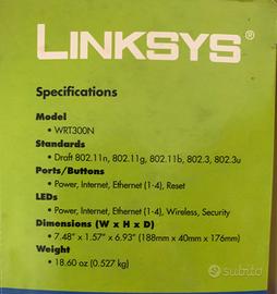 Router Cisco Linksys wireless N Modello WRT300N Usato pochissime ore Completo di accessori e di scatola originale Ottime condizioni