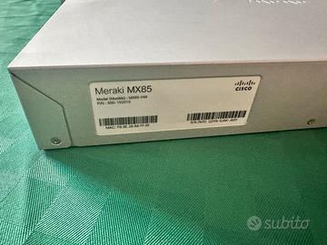 Cisco Meraki MX85-HW. Velocità di trasmissione del firewall: 1 Gbit/s, Massima velocità di trasferimento: 1 Gbit/s, Portata VPN: 0,5 Gbit/s. Numero di utenti: 250 utente(i). Tecnologia di connessione: Cablato, Velocità trasferimento Ethernet LAN: 1000 Mbit/s. Fattore di forma: 1U. Tensione di ingresso AC: 100-240 V, Frequenza di ingresso AC: 50 – 60 Hz, Consumo energetico (max): 55 W