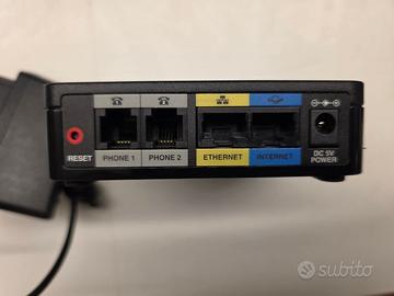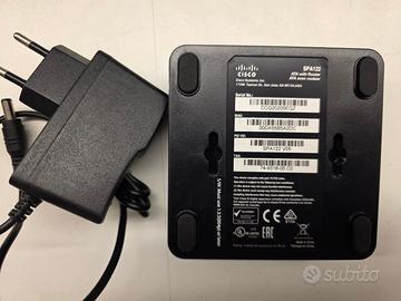 Gateway VoIP Cisco SPA122 con router integrato. - Due porte FXS per telefoni analogici. - Una porta Ethernet WAN. - Una porta Ethernet LAN. - Alimentatore DC 5V incluso. Cisco SPA122 e' un adattatore VoIP dotato di 2 porte FXS (RJ11), a cui si può collegare il tradizionale, analogico telefono o fax. Il Dispositivo ha anche funzione di router, ha porta WAN e LAN. Avanzata funzione QoS ed utilizzo di protocollo SIP (Session Initation Protocol) ha permesso di ottenere una buona qualità di suono. Ogni porta ha un numero di telefono e può essere independemente configurata. Il Dispositivo e' molto facile da configurare grazie al software