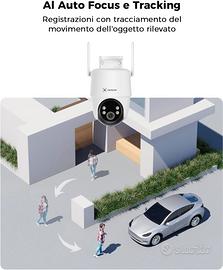 Registrazione 24/7, attivazione rapida degli allarmi e allarme sonoro e luminoso intelligente: Godetevi la registrazione video 24 ore su 24, 7 giorni su 7, con una velocità di registrazione di 2 secondi per fotogramma durante i periodi di non allarme e un avvio rapido di 0,2 secondi per la registrazione a pieno fotogramma quando scatta un allarme. Personalizzate le aree di allarme e ricevete notifiche in tempo reale con la funzione di allarme sonoro e luminoso intelligente della telecamera per esterni AOV wifi, che vi terrà informati su qualsiasi attività sospetta.Visione notturna a 30 metri, rilevamento umano AI/Tracking AI e opzioni di archiviazione flessibili: Visibilità chiara di notte grazie a un raggio d'azione a luce bianca di 30 metri e a un raggio d'azione a infrarossi di 30 metri. La telecamera da esterno AOV wifi rileva le forme umane e traccia i movimenti fino a 30 metri di distanza. Memorizza i filmati su una scheda TF (fino a 128 GB, Scheda SD non inclusa).Audio bidirezionale e batteria di lunga durata con pannello solare e resistenza alle intemperie IP66: Dotata di una batteria ricaricabile da 10000mAh e di un pannello solare da 8W, la telecamera da esterno COCOCAM AOV wifi offre una sorveglianza continua, anche in aree prive di fonti di alimentazione. Comunicate con i visitatori o i potenziali intrusi grazie alla funzione audio bidirezionale integrata nella telecamera wifi. Il grado di protezione IP66 garantisce la protezione da acqua e polvere, rendendola adatta all'uso esterno.Video ad alta definizione da 3MP e 355°Pan/90°Tilt: Cattura filmati cristallini con la telecamera di sicurezza COCOCAM AOV wifi. La risoluzione di 3MP (2304*1296) garantisce che ogni dettaglio sia visibile e facilmente distinguibile. Le capacità di rotazione orizzontale di 355° e verticale di 90° della telecamera da esterno consentono di coprire un'ampia area e di regolare l'angolo di visione da remoto, garantendo una sorveglianza completa.