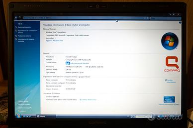 Notebook Compaq presario c700 da 15" funzionante con Windows Vista. Il tasto F7 ha la mollettina di rilascio mancante (vedi foto). Windows Vista, con batteria che non tiene + la carica. Solo consegna a mano in zona Torino.