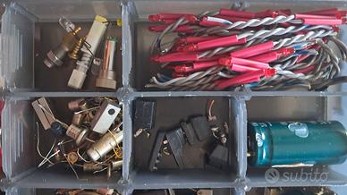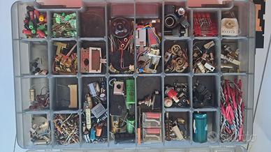 Componentistica elettronica ed elettrica, nuova ed usata, in blocco compresa cassetta professionale a due livelli Plano di cm 35x22x7 di ottima qualità apribile separatamente nei due livelli.