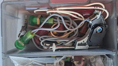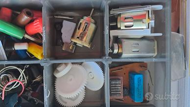 La componentistica comprende un centinaio di led rossi e verdi, lineari e triangolari (nuovi), interruttori e deviatori da pannello nuovi e vari motorini elettrici, resistenze condensatori ecc ecc; a richiesta altre foto.