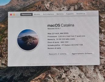Imac 27 pollici mid 2010 con CPU Intel i7 2,93mhz aggiornato con 16 gb di ram, 2 hard disk. 1 ssd da 750GB, 1 hdd da 2TB, scheda video Radeon HD5750 1gb. Tastiera USB e magic mouse.