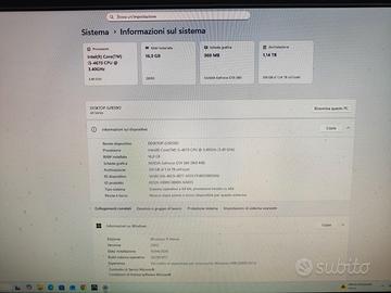 Scheda madre Asus LGA 1150 Processore intel core i5 4670 3,40 GHz Ram 16 gb Hardisk primario Ssd Crucial 240 gb Hardisk secondario 700 gb Scheda viteo asus GTX 560 Alimentatore cooler master elite 500 Dissipatore cooler master Case cooler master Scheda wifi PCIe Windows 11 Home USATO ma in perfette condizioni (PREZZO NON TRATTABILE ) SOLO RITIRO A MIO DOMICILIO monitor non compreso