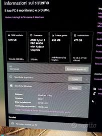 Vendo computer Lenovo ThinkStation in ottime condizioni. Cpu : Ryzem 5 Pro 4650G 6c/12t 3.7Ghz Gpu : AMD Radeon TM Ram : 8GB 2400Mhz, posso sostituire con un banco da 32gb 3200Mhz in aggiunta di 25€ SSD : 500GB Samsung OS : Windows 10 Pro Si comporta molto bene, buono anche per giocare ad alcuni titoli non molto pesanti. Con l'aggiunta di una scheda video dedicata può far girare anche titoli più pesanti. Do in aggiunta anche un cavo HDMI e cavo di alimentazione. Per informazioni non esitate a contattarmi.