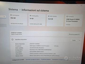 Come da titolo vendo computer così composto: Cpu AMD Ryzen 9 5900X Scheda Madre Asus ROG Strix B550F Gaming RGB Ram 32 GB Dddr4 3600 XPJ RGB (4X8GB) NUOVE Scheda Video Nvidia GeForce RTX 3080 10 GB Gddr6 Hard Disk SSD M2NVME 1TB Gen 4 NUOVO BlueThoot Alimnetatore Corsaire RM1000W Full Modulare Case ITEK ShowBui 45B NUOVO Dissipatore ITEK CR 3000 RGB NUOVO Pc pronto all'uso con Windows 11 + Office + Antivirus e programmi vari