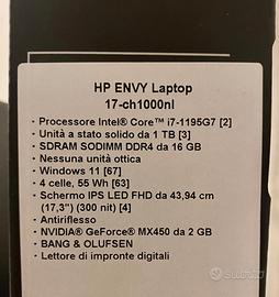 DISPOSITIVO: Laptop HP ENVY 17,3 pollici 17-ch1000 MEMORIA: 1 tera SCHEDA GRAFICA: NVIDIA GeForce MX450 RAM: 16 GB PROCESSORE: 11th Gen Intel(R) Core(TM) i7-1195G7 @ 2.90GHz SCHERMO: 1920 x 1080 60HZ DIMENSIONE: 17.3 pollici