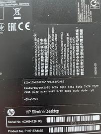 Causa sostituzione parco macchine, vendiamo Desktop HP Slimline 450-a103nl, Product n° P1H71EA - probabilmente danneggiato nel circuito di alimentazione e/o alimentatore. Processore Intel Pentium J2900 con dissipatore, mainboard Micro ATX con 2 slot per RAM DDR3L, 2 canali SATA per SSD / HDD, 1 masterizzatore DVD-Rw slim, scheda video Intel HD Graphics con VGA e DVI e 7 porte USB totali, scheda Wireless e Ethernet LAN. Incluso alimentatore originale HP 65 W con connettore 7.4x5.0mm A soli 20 euro, possibilità di spedizione in tutta Italia.