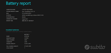Il computer si presenta in perfette condizioni e con batteria con capienza quasi pari al nuovo (immagine 4). Monta un Intel core i7 1165g7 di 11 generazione che permette di avere prestazioni elevate sia per lavoro, scuola e gaming. La scheda grafica è la Iris Xe, la più avanzata e veloce delle schede Intel. Sono installati 8gb di ram ddr4 con slot libero per aggiungerne altra. La tastiera è retroilluminata ottima per scrivere e lavorare al buio. Il disco è da 256gb SSD M2 per la massima velocità. Installato Windows 11 Pro attivato con licenza originale Microsoft. Tastiera come nuova e quasi mai utilizzata. Il laptop ha: 3x USB 3.0, VGA, HDMI, slot scheda SD, porta thunderbolt, porta per cavo LAN, Jack per cuffie e auricolari. Non sono riuscito ad aggiungere più foto a causa del limite di 6 ma scrivetemi se vi interessa qualche foto specifica o maggiori informazioni.