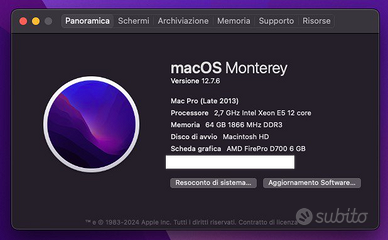 Vendo Mac Pro (Late 2013) in condizioni eccellenti, macchina affidabile e ancora molto performante per workflow professionali: montaggio video, audio, color correction, grafica, rendering e attività di produzione ad alta intensità.