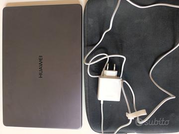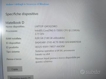 Huawei Matebook D, Processore Intel Core I5-7200U, Schermo 15.6" FHD , 1920 x 1080 Pixel, SSD da 256 GB, 8 GB di RAM. Estremamente leggero e versatile. In condizioni perfette senonché i quattro tasti a, d, g, 3 sono molto duri, quasi bloccati dopo aver pulito la tastiera con la gomma apposita. Facilmente risolvibile usando una tastiera esterna o portandolo a riparare (o aprendolo se ve la sentite). Completo di caricatore e di cover porta notebook. Scambio a mano su Milano o Trento o spedizione.
