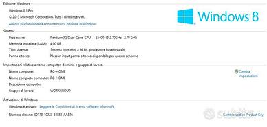 Computer fisso perfettamente funzionante: -Processore: Intel Pentium Dual Core 2.70GHz -RAM: 4GB -Hard disk: 2 da 160GB -Scheda video: ATI Radeon 2GB -Masterizzatore CD/DVD -Sistema operativo: Windows 8.1 64bit -Porte: 4 USB posteriori, 2 USB frontali, lettore schede SD Incluso cavo alimentazione, mouse wireless e tastiera. Schermo NON incluso ma disponibile a parte, prezzo da concordare.