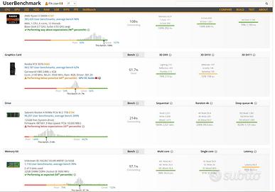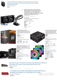 Vendo PC fisso in ottime condizioni. Vendo perchè non più necessario a lavoro. Allego foto delle varie componenti con rispettivo prezzo preso da Amazon. Considerato che le componenti sono usate, applico una scontistica qui sotto basandomi sulle prestazioni attuali del PC ottenute tramite UserBenchmark: Game 73%, Desk 109%, Work 67% CPU: AMD Ryzen 5 5600X - 107.7% GPU: Nvidia RTX 3070 - 61.7% SSD: Sabrent Rocket 4 NVMe PCIe M.2 1TB - 213.8% RAM: Unknown BL16G36C16U4R.M8FB1 2x16GB - 97.1% MBD: MSI B550-A PRO (MS-7C56) Prezzario: Processore da 154 a 100€ (prestazioni ottime) SSD da 160 a 100€ (prestazioni ottime) Scheda video da 500 a 250€ (prestazioni medie) RAM da 180 a 100€ (prestazioni ottime) Scheda madre da 110 a 50€ Alimentatore da 156 a 100€ Dissipatore ad acqua da 130 a 80€ Ventole rgb da 100 a 70€ Case da 80 a 40€ Modulo wi-fi da 30 a 10€ Tastiera Logitech GRATIS