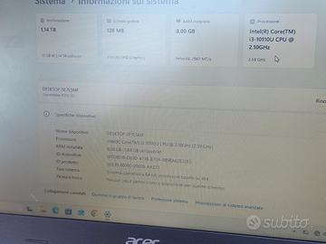 PC notebook acer travelmate p215 15 pollici CPU i3-10110U. , 2 dischi 1 SSD da 256 RAM 8 GB Windows 11 velocissimo. + alimentatore 220. qualsiasi prova