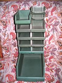 CONTENITORI, TESTER, AVVITATORE, TERMOMETRO, ALIMENTATORE 12 contenitori da laboratorio MOBIL PLASTIC – serie kombi (1xcm.L.21xH.16xP.34 – 9xL.11xH.8xP.16 – 2xL.11xH.5xP.10), 1 tester MESL per sensori d'allarme, 1 tester SONTRIX (microamperometro), 1 avvitatore BOSCH (omaggio), 1 termometro da laboratorio NUOVA ELETTRONICA, 1 alimentatore stabilizzato 220Vca-6Vcc - € 50 (Mestre - Ve)