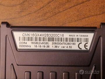 Vendo Kit Corsair Vengeance LPX 16GB DDR4 3200MHz (2x8GB) Kit memoria Corsair Vengeance LPX modello CMK16GX4M2B3200C16, 16GB totali (2 moduli da 8GB), DDR4-3200 CL16-18-18-36, 1.35V, XMP 2.0, UDIMM 288-pin. Progettati per overclock e gaming, con dissipatore in alluminio anodizzato per ottimo raffreddamento. Venduti in coppia per dual-channel (16GB totali), nuovi/come nuovi, non usati intensamente. Prezzo: 130€ Foto reali allegate (scatola e moduli).