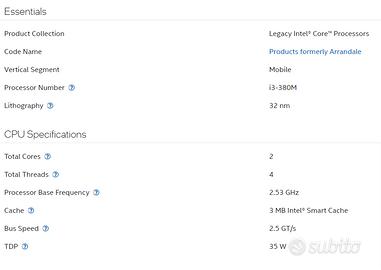 Cpu Intel Core i3-380M per notebook. Come da foto. Ottima per sostituire una CPU difettosa o per fare un upgrade da una CPU meno prestante.