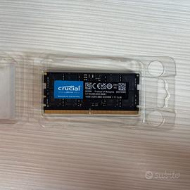 Vendo un modulo di memoria RAM Crucial DDR5 16GB SODIMM (per portatili/Mini PC) Crucial, modello CT16G48C40S5, poco usato e ben conservato. La memoria è stata acquistata nuova, usata per poche settimane a basso carico e poi tenuta riposta nella confezione di plastica originale. Consiglio di verificare anticipatamente la compatibilità della memoria con il proprio dispositivo, consultando il sito del produttore e confrontando le specifiche del proprio dispositivo con questo modello esatto di memoria. Non si accetta reso per acquisto errato o per incompatibilità col proprio dispositivo. Il prodotto viene venduto privatamente, nelle condizioni descritte e documentate dalle fotografie. Non viene fornita alcuna ricevuta o garanzia personale. L'eventuale garanzia sul prodotto sarà, nel caso, solo quella del produttore, se ritenuta ancora valida in seguito alla vendita privata. Spedizione con imballaggio accurato oppure ritiro presso il parcheggio del Maximall Oplonti di Torre Annunziata (NA) nei pressi del Leroy Merlin ed Euronics Tufano. In caso di spedizione consigliato corriere InPost.