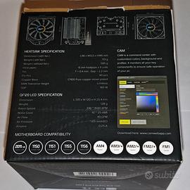 Dissipatore ad aria per CPU Intel e AMD con illuminazione LED RGB personalizzabile. In ottime condizioni e perfettamente funzionante, usato relativamente poco (PC acceso raramente). Calore max dissipabile (TDP) : 160W Supporta i socket LGA 1150 (H3), LGA 1151 (H4), LGA 1155 (H2), LGA 1156 (H), LGA 2011-v3 (R), AM2, AM2+, AM3, AM3+, AM4, FM1, FM2, FM2+