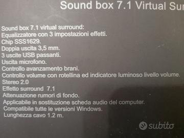 Vendo come nuova e mai usata cube soundboxe 7.1 con 3 ingressi usb, uscita microfono, stereo 2.0, effetto sorround 7.1, attenuazione rumore di fondo, utilizzabile in sostituzione di scheda audio del computer, compatibile con tutte le versioni windows e ps4, equalizzazione del suono con 3 effetti, chip sss1629.