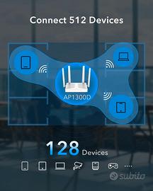 Access Point Wi-Fi dual-band con tecnologia AC1200, progettato per garantire una connessione stabile e veloce fino a 1200 Mbps (867 Mbps su 5 GHz + 300 Mbps su 2,4 GHz). Dotato di tecnologia MU-MIMO, consente di servire più dispositivi contemporaneamente senza perdita di prestazioni. Le 4 antenne esterne ad alte prestazioni garantiscono un’eccellente copertura del segnale e una distribuzione più efficace, migliorando l’esperienza utente anche in ambienti complessi o ad alta densità di dispositivi.