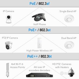 Buona compatibilità. Con la tecnologia di rilevamento automatico, questo adattatore PoE gigabit fornisce fino a 90 W a un dispositivo PoE ++ con retrocompatibilità per dispositivi PoE + 802.3 bt / a 4 coppie (60w), 802.3at 2 coppie (30w) e dispositivi PoE 802.3af (15.4w) .