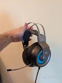Cuffie MPOW EG3pro, perfettamente funzionanti ma con il rivestimento in simil pelle spellato (come da foto). Struttura in metallo robusta, risultano tuttavia molto comode anche per lunghe sessioni. Sono presenti la ghiera di regolazione del volume e il tasto di attivazione del microfono. Funzionano tramite cavo jack 3,5mm. Hanno anche il cavo USB necessario alla retroilluminazione.