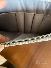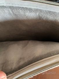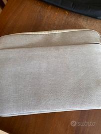 La custodia è in tessuto robusto grigio ha una tasca davanti chiusa con la cerniera e l’interno chiuso anch’ esso con la cerniera presenta un tessuto a pelouche. Le dimensioni sono altezza centimetri 26 lunghezza centimetri 36 profondità centimetri due.