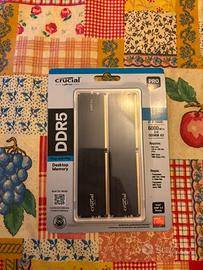 Vendo Kit di RAM Crucial DDR5 Pro per PC fisso: nella confezione ci sono due banchi da 16 GB ciascuno (totale 32 GB). Sono moduli neri, look molto semplice. Velocità dichiarata 6000 MT/s con supporto XMP 3.0 e AMD EXPO, quindi basta attivare il profilo nel BIOS per andare alla frequenza giusta.