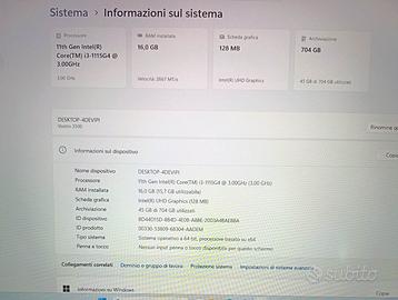 Vendo computer Notebook Laptop Pc Portatile Dell Vostro 3510. Batteria in stato EXCELLENT. Caricabatterie originale DELL. Piccoli graffi dovuti ad usura sulla scocca esposta. Pronto all'uso, adatto per Photoshop, elaborazione audio/video, ottimo per l'ufficio, per la videoscrittura, internet, youtube, film in streaming, posta elettronica, didattica a distanza, uso domestico. E' molto maneggevole grazie alla linea sottile e al peso di soli 1,7Kg. Sistema operativo: Windows 11 Pro ultima versione 25H2. Tutti i driver aggiornati con utenza di amministratore senza password o PIN. Pacchetto Office Professional Plus 2016 licenziato a vita Disco rigido primario: SSD M.2 MVMe PCIe, 256 GB Solid State Drive Disco rigido secondario: 500GB HDD 2,5" SATA 5400rpm Scheda grafica integrata Intel® UHD Graphics Intel® Core™ i3-1115G4 Processor 3.0 GHz (6M Cache, up to 4.1 GHz, 4 Threads) Memoria RAM 16GB DDR4 3200 MT/s upgradabile fino a 32GB con 50euro in più Schermo 15.6" FHD (1920 x 1080) Retroilluminazione LED antiriflesso Bordo stretto WVA Porte : 1 x Lettore di schede SD, 1 x USB 2.0, 2 x USB 3.2, 1 x HDMI 1.4, 1 x Cuffie e microfono Audio Jack Ethernet LAN (RJ45) Audio: altoparlanti stereo. Connettività wireless: 802.11ac 1x1 WiFi e Bluetooth. Batteria interna: 3 celle 42Wh (32Wh rimanenti a piena carica 76%) Colore: antracite Consegna a mano nella città di Siena. Possibilità di scambio su Arezzo, Firenze, Prato, Pistoia. Col servizio Tuttosubito spedizione in tutta Italia. Non accetto proposte d'acquisto, d'accordo sul prezzo faccio io l'offerta valida per 48ore. Tel. 3501333975
