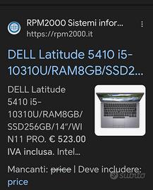 Dell Latitude 5410 con processore i5 di 10a generazione , monitor full HD da 14 pollici, 16Gb Ram e 240Gb Gb disco Nvme, Intel UHD Graphics con uscita HDMI, tastiera retroilluminata. Audio e batteria ottimi. Installato Windows 11Pro con licenza e pacchetto Office