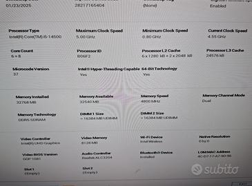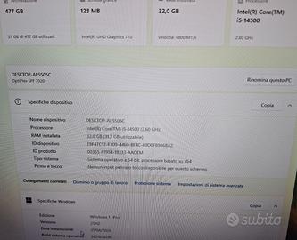 Pc in ottime condizioni con tastiera mouse nuovi e antenne wi-fi. descrizione : Processore Famiglia processore Intel® Core™ i5-14500 Memoria 16 GB DDR5-SDRAM scheda grafica integrata:Intel UHD Graphics 770 Connettività Quantità porte USB 2.0: 4 Quantità di porte USB 3.2 Gen 1 (3.1 Gen 1) di tipo A: 3 Quantità di porte USB 3.2 Gen 1 (3.1 Gen 1) di tipo C:1 Quantità porte HDMI:1 Versione HDMI: 1.4b Quantità DisplayPorts: 1 versione DisplayPort:1.4a Jack combinato per microfono/auricolare:Sì Numero di porte USB posteriori:4 Numero di porte USB anteriori:4 Numero di porte audio anteriori:1 Collegamento ethernet LAN: Sì Wi-Fi: Sì Velocità trasferimento Ethernet LAN: 10,100,1000 Mbit/s Tecnologia di cablaggio: 10/100/1000Base-T(X) Wi-Fi standard:Wi-Fi 6E (802.11ax) Standard Wi-Fi:802.11a, 802.11b, 802.11g, Wi-Fi 4 (802.11n), Wi-Fi 5 (802.11ac), Wi-Fi 6E (802.11ax) Produttore del controller WLAN:Intel Modello di dispositivo di controllo WLAN:Intel Wi-Fi 6E AX210 Tipo di antenna:2x2 Bluetooth:Sì Capacità SSD:512 GB Interfaccia Solid State Drive (SSD):PCI Express NVMe:Sì Dimensione SSD:M.2 windows 11 pro 25h2