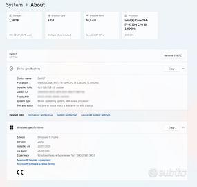 Vendo notebook Dell G7 17 (7790) in eccellenti condizioni estetiche e perfettamente funzionante, utilizzato solo per lavoro (grafica e montaggio video), mai stressato con gaming intenso. Caratteristiche tecniche CPU: Intel Core i79750H @ 2.60 GHz (6 core / 12 thread) RAM: 16 GB GPU: Nvidia GeForce RTX 2060 6 GB GDDR6 + Intel UHD Graphics 630 Archiviazione: SSD NVMe PCIe 512 GB (disco principale) SSD 1 TB (secondo disco, ideale per progetti e archivi) Schermo: 17,3" FHD (1920x1080), 144 Hz, 300 nits Connettività: Intel USB 3.1, Killer E2500 Gigabit Ethernet Audio: Realtek Audio Sistema operativo: Windows 11 originale, con licenza Stato e note: Il portatile è in ottime condizioni, sempre tenuto con cura. Unica nota: la batteria ha un’autonomia ridotta, quindi è ideale per uso prevalentemente da scrivania (con alimentatore collegato). Completo di alimentatore originale. Disponibile a qualsiasi prova. Consegna Preferibile ritiro a mano su Roma. Eventuale spedizione possibile, a carico dell’acquirente, con imballo accurato.