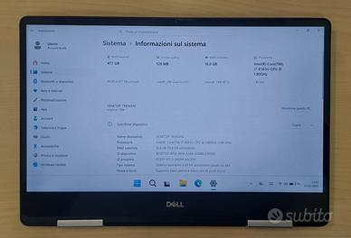 Vendo elegante laptop convertibile Dell Inspiron 7386 (serie 7000) in ottime condizioni. Un dispositivo premium che unisce la potenza di un PC alla versatilità di un tablet, grazie al design sottile e allo schermo touch. Specifiche Tecniche: Processore: Intel Core i7-8565U (fino a 4.60 GHz in Turbo Boost) – Prestazioni elevate per multitasking e lavoro creativo. Memoria RAM: 16 GB – Gestisce senza sforzo numerose applicazioni aperte contemporaneamente. Archiviazione: 512 GB SSD (477 GB effettivi) – Avvio rapido e spazio generoso per i tuoi file. Display: Touchscreen da 13.3" con supporto Input Penna e Tocco (10 punti di contatto). Grafica: Intel UHD Graphics 620. Sistema Operativo: Windows 11 Home (già configurato e pronto all'uso). Punti di Forza: Design 2-in-1: Cerniera a 360° per usarlo in modalità laptop, tenda o tablet. Portabilità: Telaio in alluminio leggero e compatto, ideale per studenti e professionisti in movimento. Sicurezza: Integrità del sistema aggiornata e ottima autonomia residua. Durata ottima della batteria.