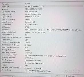 POTENTE E PROFESSIONALE DELL LATITUDE 7420 ULTRABOOK CON SCHERMO 14”POLLICI FULL HD RISOLUZIONE 1920X1080.PROCESSORE INTEL QUAD CORE I7-1165G7 DI UNDICESIMA GENERAZIONE-SSD512GB NVME-16GB RAM DDR4 A 3200Mhz-SCHEDA VIDEO INTEL IRIS XE GRAPHIC.DOTATO DI WEBCAM INTEGRATA DOPPIA CON RICONOSCIMENTO FACCIALE-WIFI-BLUETOOTH-USB 3.2-USB TYPE-C THUNDERBOLT-TASTIERA RETROILLUMINATA ORIGINALE ITALIANA-BATTERIA NUOVA!(COME DA REPORT DI STATO IN FOTO)-ALIMENTATORE ORIGINALE.INSTALLATO WINDOWS 11 PRO 25H2 LICENZIATO CON TUTTI I PROGRAMMI COMPRESA LA SUITE DI OFFICE 2024 PRO PLUS ATTIVATA.IPERVELOCE,PERFORMANTE E LEGGERO IN CONDIZIONI SUPERLATIVE POCHISSIMA USURA.COMPLETAMENTE IGENIZZATO.MACCHINA FANTASTICA.