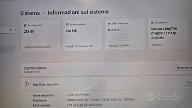 Vendo come da foto notebook Dell Latitude E7470, con alimentatore originale Dell. Il pc è in buone condizioni e funzionante, non provvisto di batteria. Caratteristiche del computer: Processore Intel i7-6600U vPro RAM 8GB Memoria interna 256GB SSD NVME Sistema operativo Windows 11 Pro Tastiera italiana retroilluminata Ingresso per cavo LAN internet Webcam, WIFI e Bluetooth Lettore impronta digitale Slot Schede SD e Smart Card Slot scheda SIM Uscita Jack audio cuffie 3x USB 1x HDMI Video 1x DisplayPort mini Possibilità di ritiro a mano o spedizione. No tuttosubito.