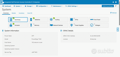 Specifiche tecniche Produttore: DELL Tipo di dispositivo: Server Design: Tower Modello: PowerEdge T340 Alloggi per dischi rigidi: 8x 3.5" HDD SAS/SATA 6Gb/12Gb backplane Unità ottica: Slim Networking: Broadcom 5720 Dual Port 1GbE Interfacce interne: 1 socket CPU Intel per serie XEON E-2100 4 slot DIMM DDR4 ECC fino a 64 GB 4 slot PCIe: - 1 slot PCIe x16 con larghezza di banda x8, 3.0, full-length, full-height - 2 slot PCIe x8 con larghezza di banda x4, 3.0, full-length, full-height - 1 slot PCIe x1 con larghezza di banda x1, 3.0, full-length, full-height Interfacce esterne: 3 porte USB 3.0 (1 frontale) 5 porte USB 2.0 (1 frontale) 2 porte LAN RJ-45 Gigabit 10/100/1000 Mbit 1 porta DELL iDRAC9 Basic con Lifecycle Controller 1 connettore VGA D-SUB a 15 pin 1 interfaccia seriale RS232 Scheda grafica: integrata Alimentatori: 1 alimentatore Dell HotSwap Cover frontale con chiusura con chiave. Peso netto: 17 kg Dimensioni: L: 57,5 cm | P: 22 cm | A: 44,5 cm Condizioni dell'articolo: ricondizionato, Grado A Configurazione proposta: CPU Intel XEON E-2124 Ram 1x8GB DDR4 @2666 ECC Controller Raid PERC H330 SSD SATA da 256GB (boot; nuovo, solo ore di installazione) SSD NVMe da 256GB su scheda PCIe (free; nuovo, solo ore di installazione) Alimentatore HotSwap da 495W OS VMWare ESXi vSphere 8 Hypervisor (DELL custom image ver. 8.0u3) Dispositivo usato, ricondizionato personalmente, pronto all'utilizzo. No perditempo, solo se veramente interessati. Offro e richiedo massima serieta'. Contatto via WhatsApp al numero scambiato sulla chat di Subito.it. Scambio a mano Bologna/Casalecchio oppure spedisco con TuttoSubito.it. Compravendita fra privati: l'oggetto viene venduto visto e piaciuto con esclusione di ogni garanzia eccezion fatta per dolo o malafede del venditore.