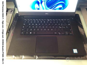 Vendo Notebook Dell Precision 5530 con processore Intel i7 2.60 Ghz, schermo 15.6" FHD risoluzione 1920x1080 in ottimo stato, doppia scheda video "Intel UHD Graphics 630, NVIDIA Quadro P1000 da 4GB" e tastiera retroilluminata.