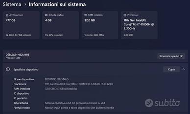Laptop professionale ultraportatile da 15,6 IPS - FHD+ (1920x1200) con scheda video integrata Intel UHD + scheda video dedicata nVidea T1200 da 4GB . Equipaggiato con 32 GB DDR4 ha un disco M2 Nvme da 512 GB/s e dispone di 2° slot M2 Nvme libero; Processore Intel 11th Gen. i7-11800H; fingerprint e cardReader; 3 porte USB-C di cui 2 sono Thunderbolt 4. Equipaggiato con Windows 11 Professional + Office 2019 Professional. La batteria è in ottime condizioni. Non ha alcun tipo di segni di usura o graffi, mai stato in assistenza ed è pari al nuovo. Il portatile è indicato per grafici, CADisti, programmatori etc. NON SPEDISCO, CONSEGNA A MANO.
