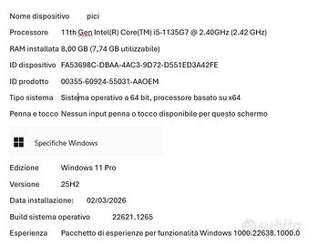 in ottime condizioni. imballo originale. usato pochissimo. Processore Intel CORE I5. Computer portatile 39,6 cm (15.6") Full HD 8 GB DDR4-SDRAM 256 GB SSD Wi-Fi 5 (802.11ac). vedi ulteriori info nelklke foto