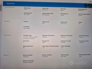 Lievi segni di usura sulla scocca, ma perfettamente funzionante! Intel i7 11th generation 1165G7 Ram 16Gb LPDDR4 Disco 512Gb NVMe Monitor 13.4 Touch 3840*2400 Scheda Video Intel Iris XE Graphics Alimentatore 45W Peso 1.32 Kg
