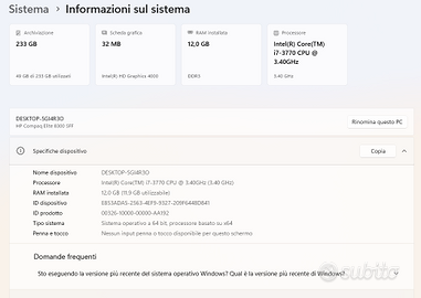 Configurato come segue: Processore: Intel I7-3770 3.40 GHz Windows 11 Home edition Scheda grafica Intel HD Graphics 4000 RAM 12 GB DD3 1 HD SSD 512 GB 1 HD SSD 128 GB