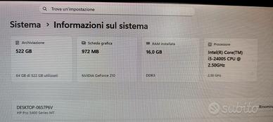 Vendo PC fisso HP Pavilion modello PRO 3400MT in ottime condizioni e pronto per essere utilizzato. Ideale per ufficio, smart working, scuola e programmi di grafica leggera. 🔧 Caratteristiche tecniche • CPU: Intel Core i5 2400S • RAM: 16 GB DDR3 • SSD: 240 GB • HDD: 320 GB • Scheda Grafica esterna NVIDIA GE FORCE 210 (1 GB) • Sistema operativo: Windows 11 Pro • Software: Microsoft Office 2024 🖥️ Condizioni • Case originale HP Pavilion • Nessun difetto Viene consegnato con cavo di alimentazione. Ritiro/Consegna su Taranto. Astenersi affaristi e perditempo. Non spedisco.