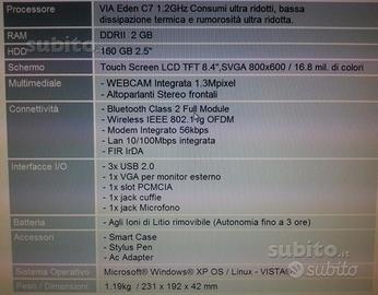 Computer Devo Evobook Plus con schermo touch screen 8,4 pollici,sistema operativo Windows XP,incluso come da foto borsina per il trasporto del computer e borsina per il trasporto dell'alimentatore.Inoltre il cavo per collegarlo ad un normale monitor TV con la presa VGA ed il disco di ripristrino del sistema operativo che già allo stato attuale è pulito pronto all'utilizzo.