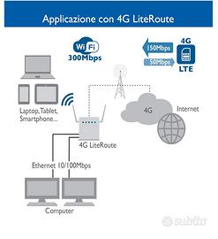 N.B : prodotto nuovo , prezzo in commercio 86 euro. Digicom 4G LiteRoute 8E4617 la soluzione per lo smart working, facile, veloce e senza configurazione LTE fino a 150 Mbps, Wi-Fi N fino a 300Mbps, 2 Porte LAN. Antenne staccabili. 4G LiteRoute è un Router 4G/LTE ideato per applicazioni dove non è presente la linea ADSL o per rafforzare la banda dati quando condivisa con altri utenti. Con il Router 4G Digicom e una economica SIM puoi disporre immediatamente di un collegamento performante per le tue esigenze lavorative. Semplice e veloce da installare, riconosce automaticamente i principali operatori che dispongono di una rete mobile.