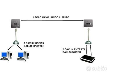 Adattatori di rete che permettono di collegare 2 linee cat. 5E su un cavo solo. Devono essere usati a coppie, un adattatore a ogni presa a muro. Entrano, quindi, 2 linee cat. 5E dallo switch di rete nel primo splitter dentro la prima presa a muro; lungo il muro corre un cavo solo; dall'altra presa a muro si collega l'altro sdoppiatore dal quale escono nuovamente 2 linee cat. 5E. Il vantaggio è che si può usare un singolo cavo di rete a muro, anziché usarne due.