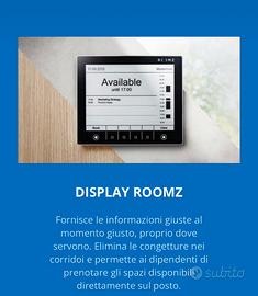 Soluzione per sale riunioni Una soluzione completa per gestire in modo efficiente le prenotazioni delle sale riunioni Display SILVER Incl. software subscription I cartelli digitali wireless per porte ROOMZ per sale riunioni forniscono le informazioni giuste al momento giusto, nel posto giusto. Nessun cavo: I display ROOMZ vengono semplicemente incollati e aderiscono su vetro, legno o muratura. Non è necessario eseguire alcun tipo di operazione di aggramatura, non è necessario praticare fori Connessione Wi-FI : ROOMZ si collega alla rete WiFi esistente, non è necessario installare nulla di più. Sono supportati WEP, WPA e WPA2 Enterprise Bassa potenza: Più di 2 anni di autonomia nel display ROOMZ e più di 4 anni di autonomia nel sensore ROOMZ. Sostituzione semplice della batteria Sicurezza: protocolli di comunicazione e crittografie sicuri Cloud o On premise : ROOMZ può essere utilizzato direttamente dal cloud o da On premise Go Green: I prodotti ROOMZ sono estremamente efficienti dal punto di vista energetico. Un contributo per una maggiore sostenibilità nell'uso degli uffici Installazione semplice: Nessun cavo Il sistema di prenotazione spaziale ROOMZ è installato in pochi minuti e si collega automaticamente a una rete WiFi esistente. Prezzo per un display Ne ho 4 , accetto offerte per tutti e 4 a 1800€