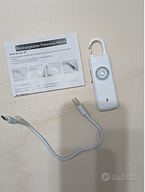 Utile accessorio da portare sempre con sè. In borsetta, appeso al collo oppure come porta chiavi, questo dispositivo se sganciato dal suo supporto, emette un suono udibile a distanza, (130 db) e contemporaneamente si accende la luce in dotazione. Indispensabile in caso di aggressione, malore, situazione di pericolo e/o di emergenza generica. La luce può essere attivata indipendentemente dal sistema di allarme con luce fissa o lampeggiante, anche questa alta visibilità. Dotato di cavo usb di ricarica. Disponibile anche nei colori rosa e nero, a richiesta in fase di acquisto.